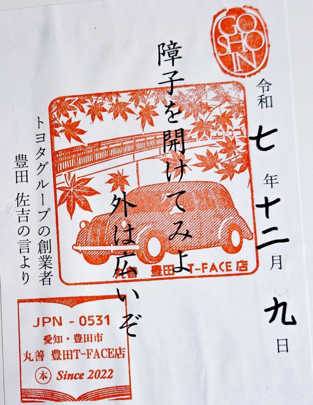 豊田の紅葉名所「香嵐渓」と乗用車をモチーフにしたデザイン。車の町らしい粋な御書印です。