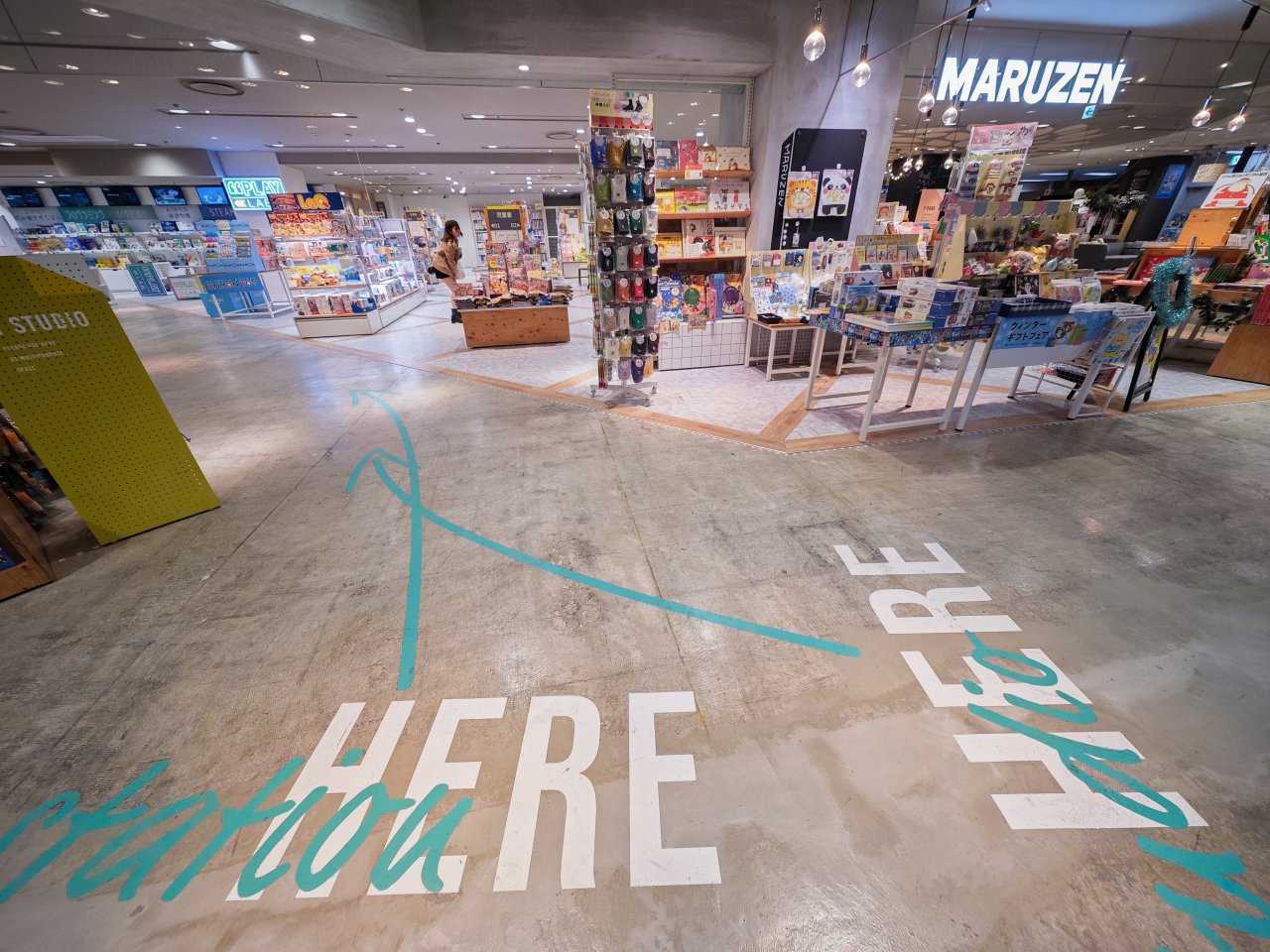 コンクリート風の床と、目線が奥まで抜けていくような解放感がお洒落な丸善。都市型の機能美と、本屋の知的で好奇心あふれる雰囲気を共存させたようです。
