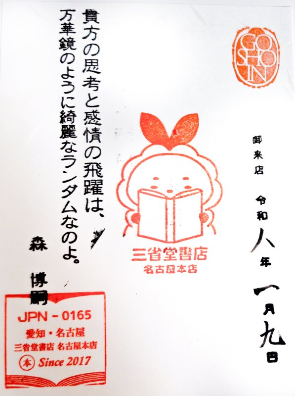 印影のキャラクターは三省堂書店東海地区公式ゆるキャラ「名古屋本店えびふわちゃん」だそう。2017年4月17日生まれ(名古屋本店オープン日)です。