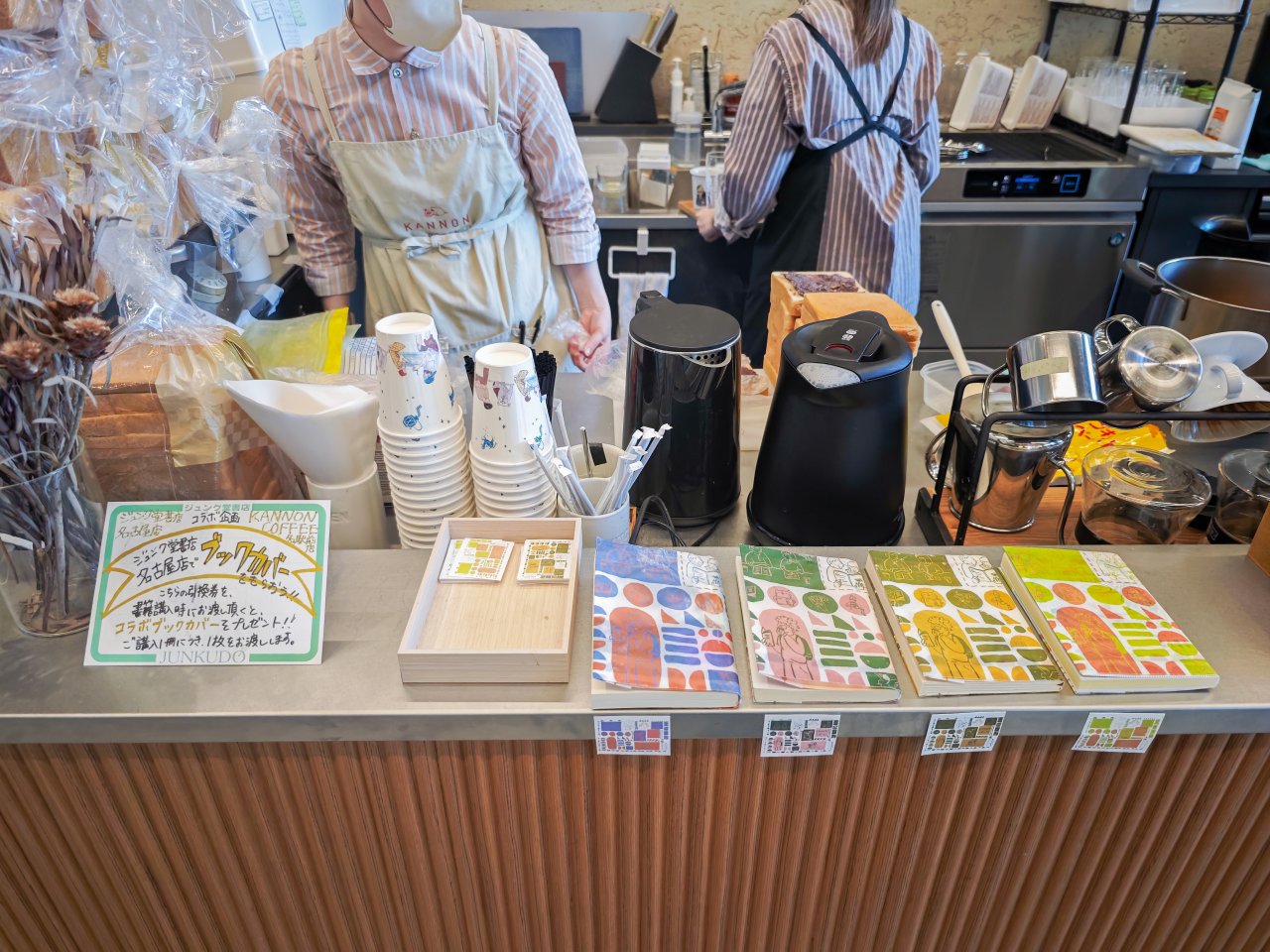 この日の御書印巡りの朝、偶然寄ったカフェで面白いものを見つけました。名古屋の人気カフェ『KANNON COFFEE』とのコラボ企画で、店舗にあるショップカードを持っていくと、ジュンク堂書店名古屋店でオリジナルブックカバーがもらえます。