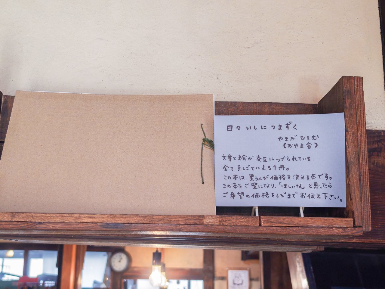 日々いしにつまずく(やまだひろむ 著)すべて手仕事による一冊で、買う人が価格を決める本。欲しいと思ったら希望の価格を伝えてレジに持っていくそうですが、これを買うのかなり勇気がいりませんかね。自分自身の器を試されているような気分です笑