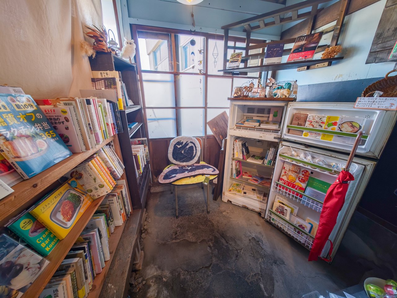 店舗奥には冷蔵庫を書棚にしたユニークな陳列。しかもこの一角はすべてレシピ本や料理エッセイなど食にまつわるものばかり。
