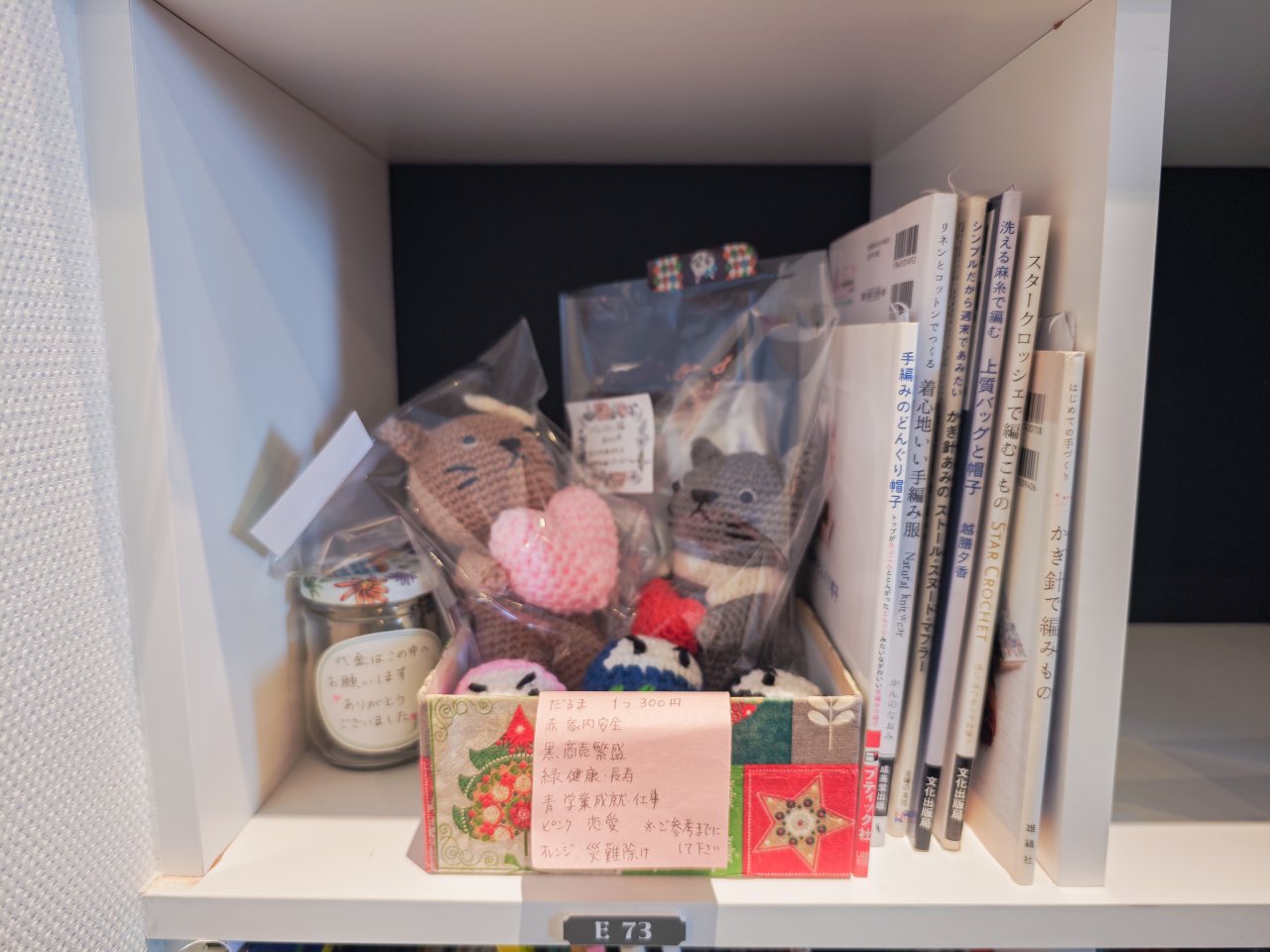 最近流行りの編み物を棚に置いてる人をちらほら見かけますが、こちらは作品と本まで編み物づくし。編み物でできたダルマがころころして可愛いです。