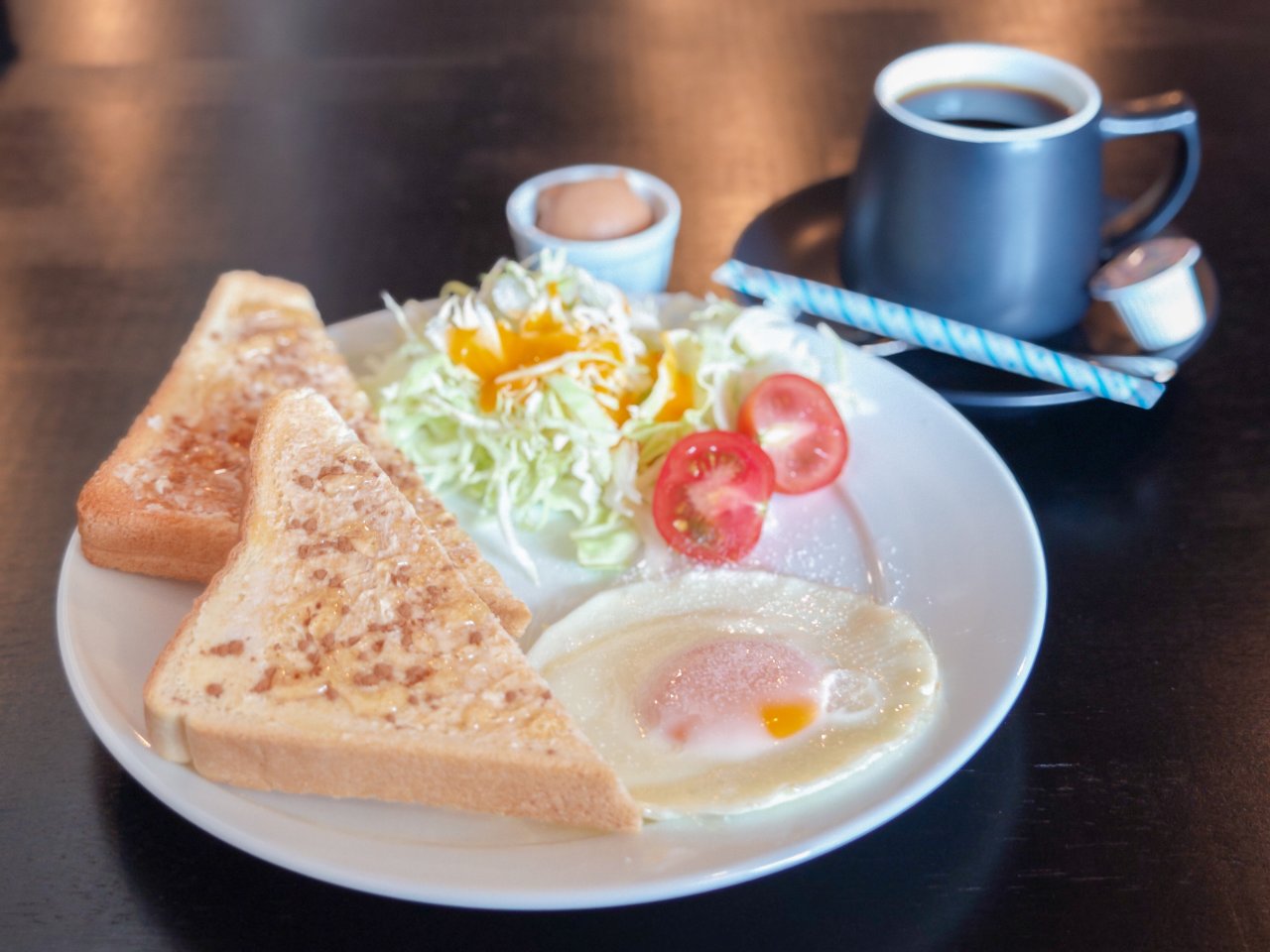 ツキネコブレンド 550円に、トースト、サラダ、目玉焼き、プチカステラがサービスです。人気No1のはちみつシナモントーストにしました。
