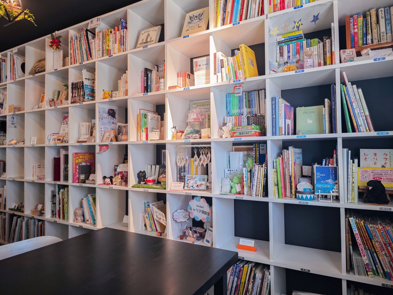 そしてテーブル席の奥にある巨大な棚がシェア本棚で、この棚の一つ一つに棚主が思い入れのある本や作品を置いてます。