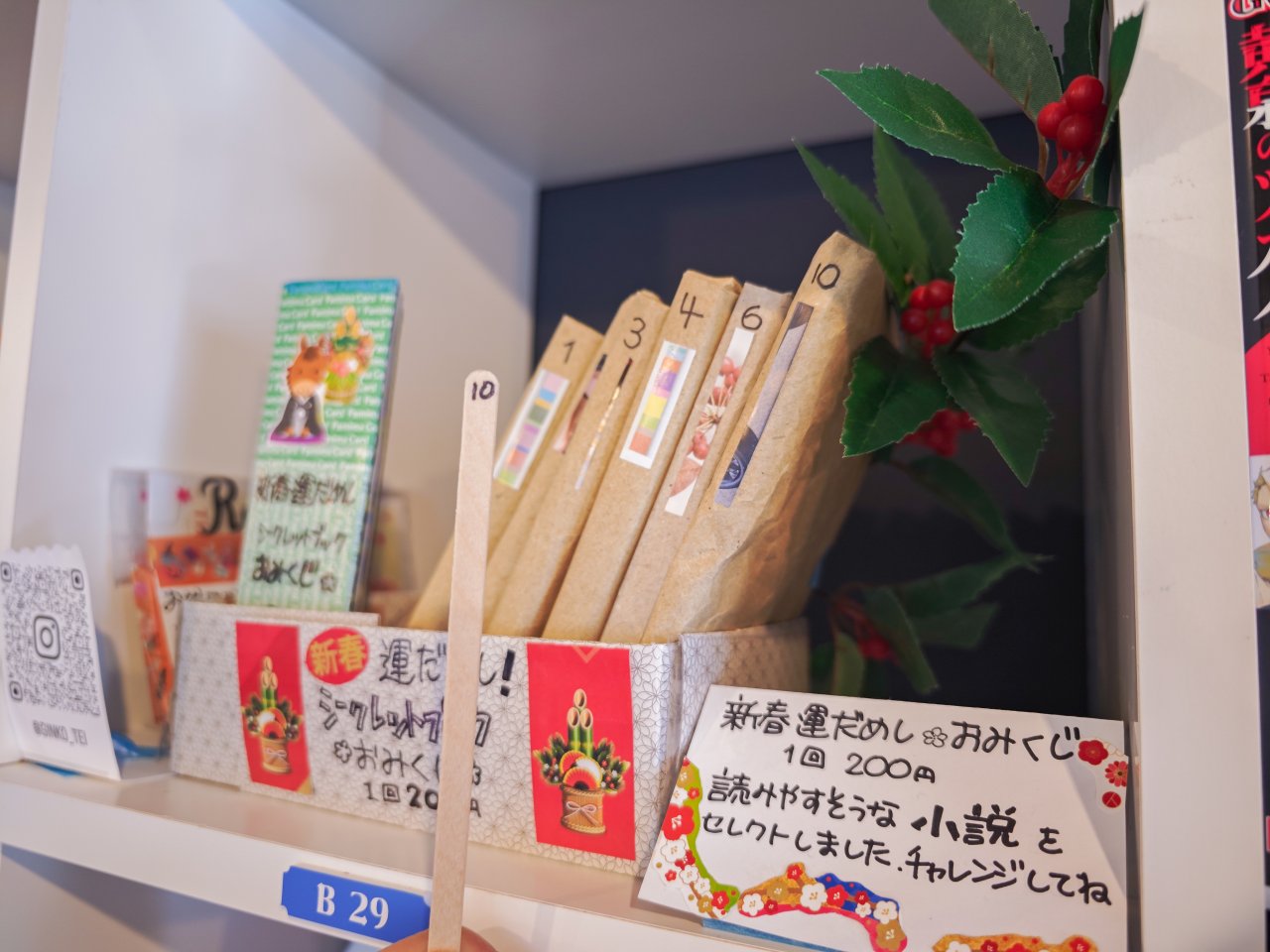 銀狐亭さんの棚で、文庫本にカバーをかけておみくじでランダムに販売する楽しい試みです。私も1本くじを引いたところ下町不思議町物語という本が出ました。