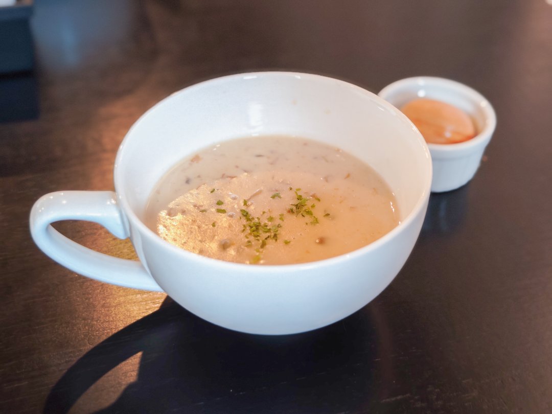 +250円でミネストローネかクラムチャウダーを追加できます。どちらも飲みましたが、朝にホッとする美味しいスープでした。