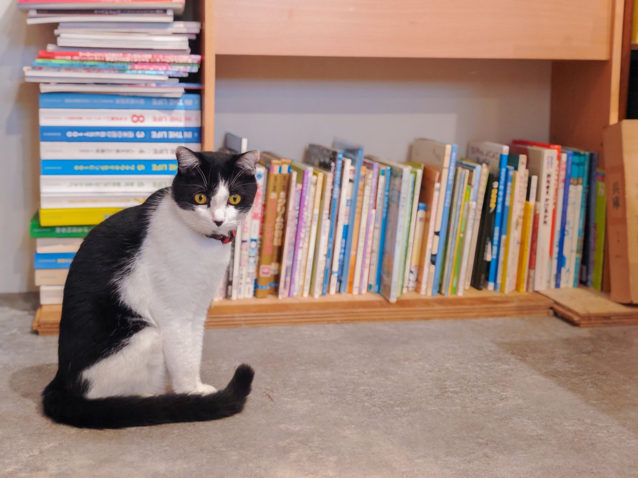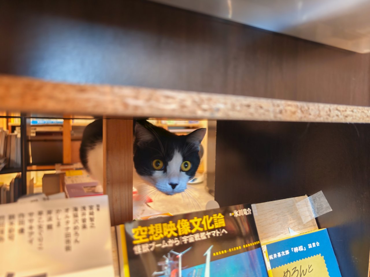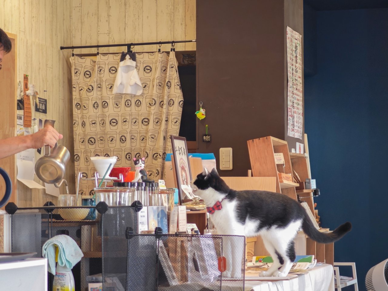 気になる看板猫ハチは、カウンターに行ったり本棚の隙間からのぞき込んできたり。店内を縦横無尽にパトロールしています。