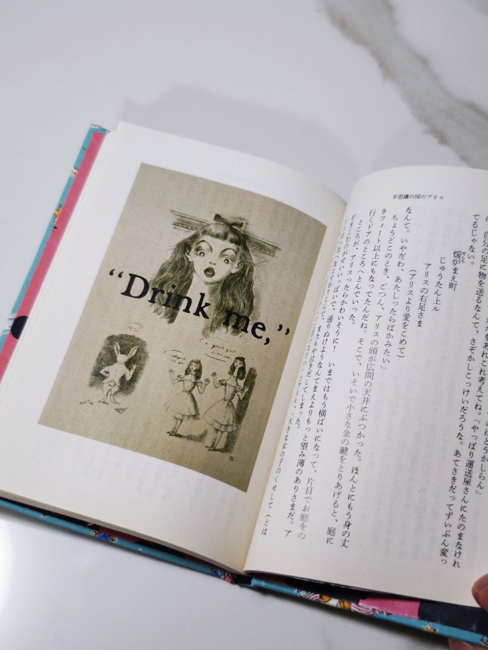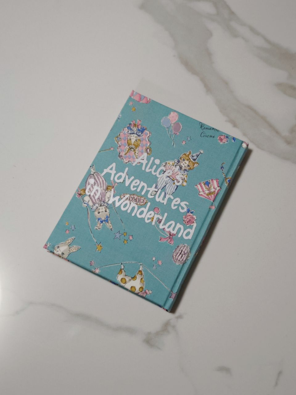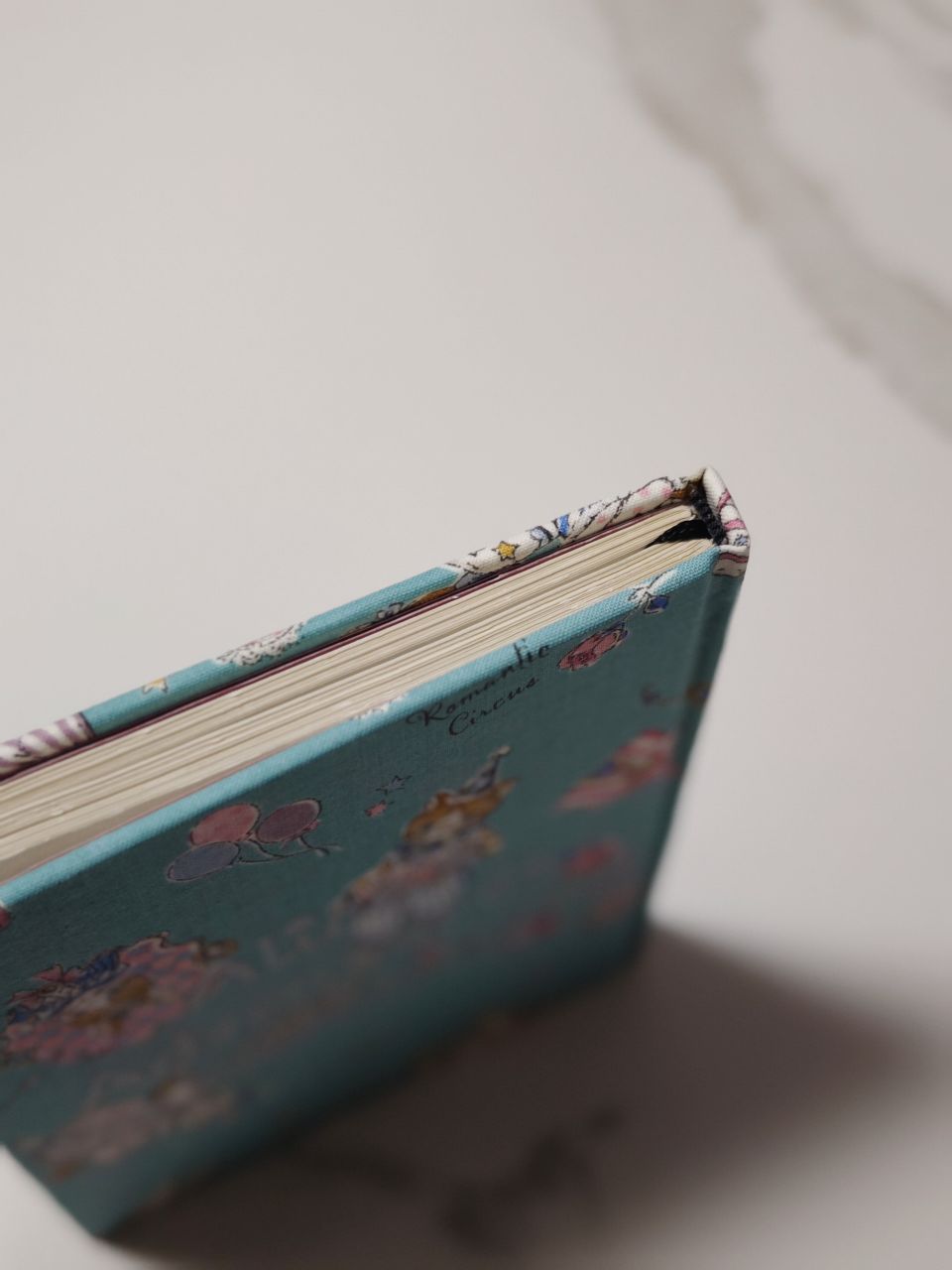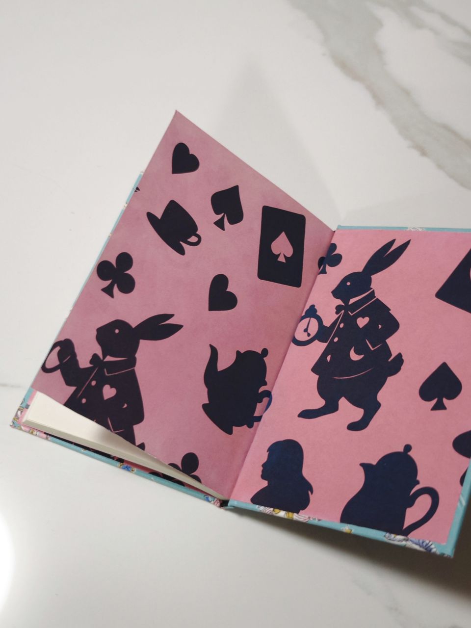 明るくファンシーなアリスによせた雰囲気の布を表紙に使用したハードカバーに改装。見返しにはアリス風のパターン柄を制作して使いました。