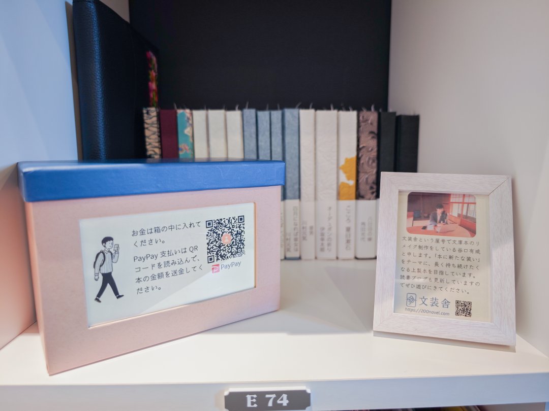 棚には什器として文装舎の紹介と、代金の受領箱を置きました。